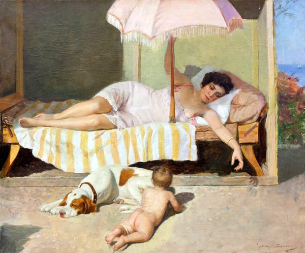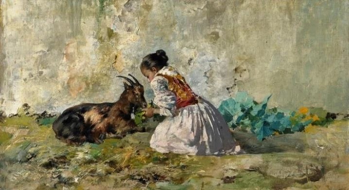 What is marvelous to see in this collection of paintings from before WWII is that these mostly European and U.S. artists (many of whom often depicted animals in their art) reveal a sensitivity, affection and/or respect between humans and other species in everyday life. This selection of artwork illustrates that a casual, mutual, often loving relationship with other animals is nothing new, but old as time. Most of these paintings pair young people with animals they care for, especially when regarded as family. Look closely and you’ll see that the animals depicted in these paintings see and hear everything, often with greater insight than their human counterparts.