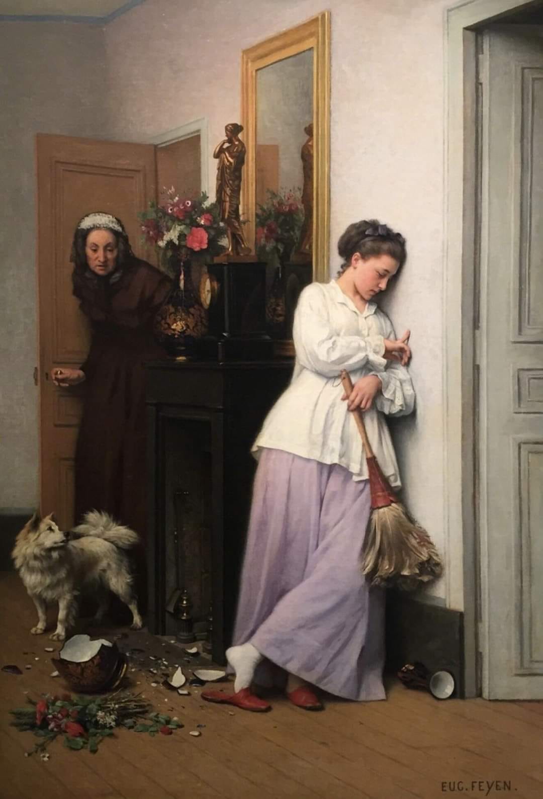 We also find echoes of subject, style, and form. Consider how Ubertini’s (Bacchiacca’s) Portrait of a young lady holding a cat (1525-30) resonates with da Vinci’s earlier Lady with an Ermine (1489-1491). Compare these to Valadon’s Louison and Raminou (1920), where the cat is supported rather than held, and Louison looks at the cat in thought, rather than at the viewer or into the ether. Bloch’s In a Roman Osteria (1866) was inspired by Marstrand’s Italian Osteria Scene, Girl welcoming a Person entering (1847). For Bloch and Marstrand, notice how the animals are present yet excluded from the meal – and all interactions – in a public space. The same is seen in Millais’ Isabella (1849) based on Boccaccio’s Decameron novel Lisabetta e il testo di bassilico, where Isabella is comforting her frightened dog (being kicked by one of her violent brothers). In contrast, there are five paintings of women giving food or drink to animals, especially Reichert’s domestic scene, Feeding Dog, with a young dachshund being fed at the kitchen table: the gender-coded promise of hearth and home.