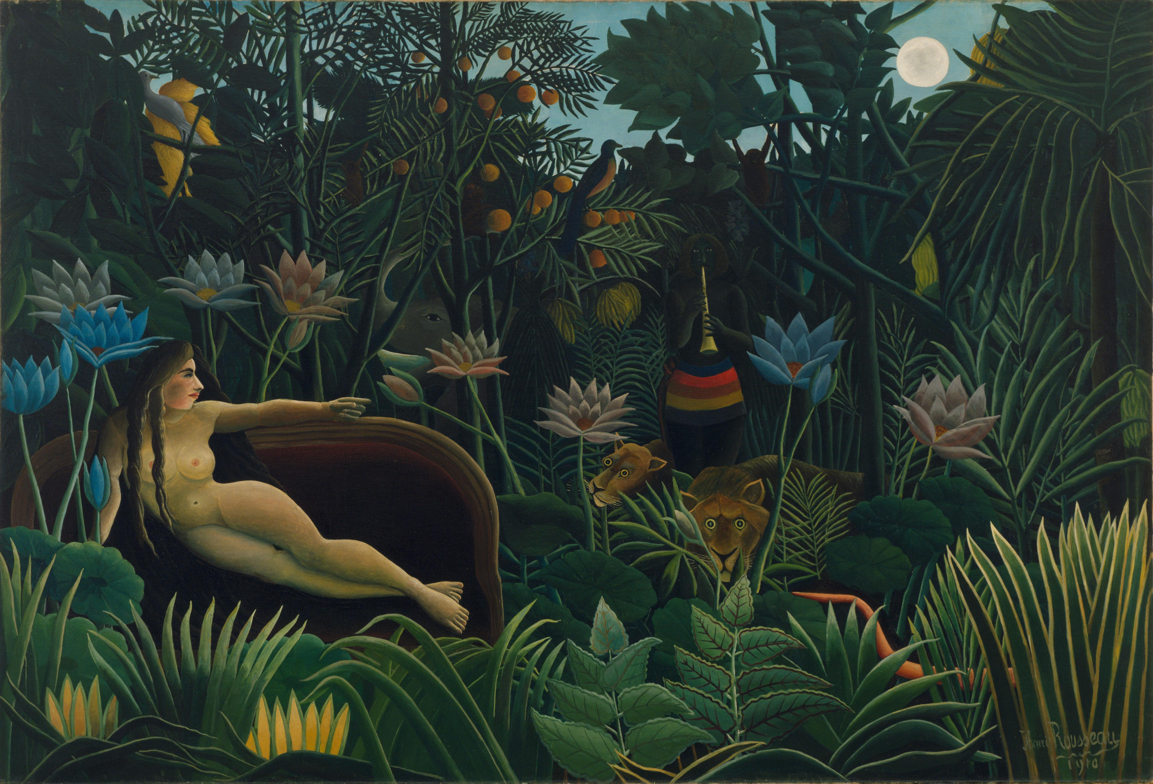 Then we have Rousseau’s almost surreal Le Rêve, a.k.a. The Dream (1910), in conversation with Collier’s Circe (1885). In addition to private and public spaces, these paintings, and others, showcase another sphere – that of wilderness. Still, for Rousseau, cultural attachments and biases vis-à-vis the divan, flute, and multicolored wrap present a choreography of nature and culture.