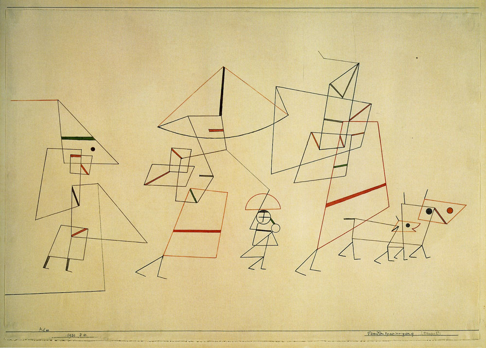 By 1920, Suzanne Valadon’s Louison and Raminou, doesn’t just show the interaction between a human and a cat, but blurs any preconceived notions of difference to heighten their affinity with one another – their sameness in the coloring of the cats fur and Louison’s face, hands, and hair. This is further illustrated by Klee in 1930 by his Familienspaziergang (Tempo II) (Family Walk) – parents, children and dogs are essentialized as stick figures with the same colors. The only difference is their shape.